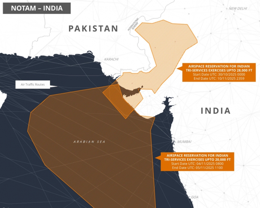 ಹೊಸ ನೋಟಾಮ್ ಬೃಹತ್ ಪ್ರದೇಶವನ್ನು ಒಳಗೊಂಡಿದೆ. ಪಶ್ಚಿಮ ಗಡಿಯಲ್ಲಿ ಭಾರತ ತನ್ನ ತ್ರಿ-ಸೇವೆಗಳ ವ್ಯಾಯಾಮಕ್ಕಾಗಿ ಹೊಸ ಅಧಿಸೂಚನೆಯನ್ನು ಹೊರಡಿಸಿದೆ, ಈಗ ಪೂರ್ಣ ದಿನಕ್ಕೆ ಅರೇಬಿಯನ್ ಸಮುದ್ರದ ದೊಡ್ಡ ಭಾಗವನ್ನು ಆಳವಾಗಿ ವಿಸ್ತರಿಸಿದೆ.