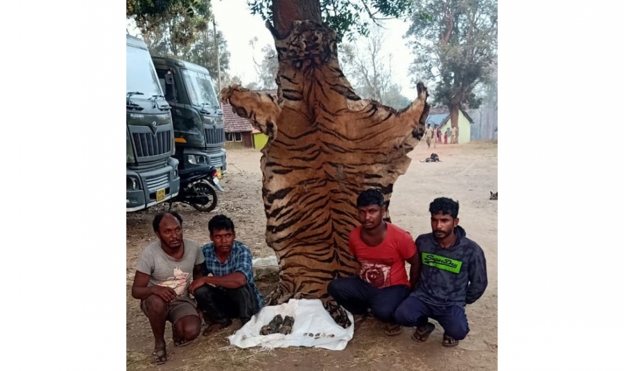 ಬಂಧಿತ ಆರೋಪಿಗಳನ್ನು ಹರೀಶ್, ರಮೇಶ್, ಮನು ಹಾಗೂ ರಾಜೇಶ್ ಎಂದು ಗುರುತಿಸಲಾಗಿದ್ದು, ಸತ್ತುಬಿದ್ದಿದ್ದ ಹುಲಿಯ ಚರ್ಮ ತಂದು ಒಣಗಿಸಿ, ಉಗುರು ಹಾಗೂ ಪಾದಗಳನ್ನು ಕತ್ತರಿಸಿ ಮಾರಾಟ ಮಾಡಲು ಯತ್ನಿಸಿದ್ದರು ಎನ್ನಲಾಗಿದೆ. ಬಂಧಿತರಿಂದ ಹುಲಿಯ ಚರ್ಮ, 7 ಉಗುರು, 2 ಕಾಲನ್ನು ಪೊಲೀಸರು ವಶಕ್ಕೆ ಪಡೆದಿದ್ದಾರೆ.
