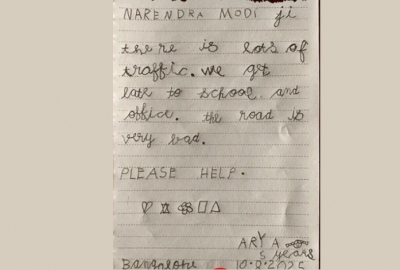 ಸಾಮಾಜಿಕ ಮಾಧ್ಯಮದಲ್ಲಿ ಈಗ ವೈರಲ್ ಆಗಿರುವ ಮಗುವಿನ ಪತ್ರ ಹೀಗಿದೆ: "ನರೇಂದ್ರ ಮೋದಿ ಜಿ, ಸಾಕಷ್ಟು ಸಂಚಾರ ದಟ್ಟಣೆ ಇದೆ. ನಾವು ಶಾಲೆ ಮತ್ತು ಕಚೇರಿಗೆ ತಡವಾಗಿ ಹೋಗುತ್ತೇವೆ. ರಸ್ತೆ ತುಂಬಾ ಕೆಟ್ಟದಾಗಿದೆ. ದಯವಿಟ್ಟು ಸಹಾಯ ಮಾಡಿ. - ಆರ್ಯ 5 ವರ್ಷ"